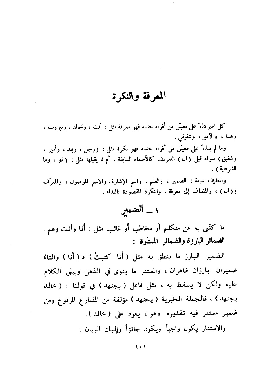كل اسم دل على معيّن من أفراد جنسه فهو معرفة مثل: أنت، وخالد، وبيروت، وهذا، والأمير، وشقيقي.