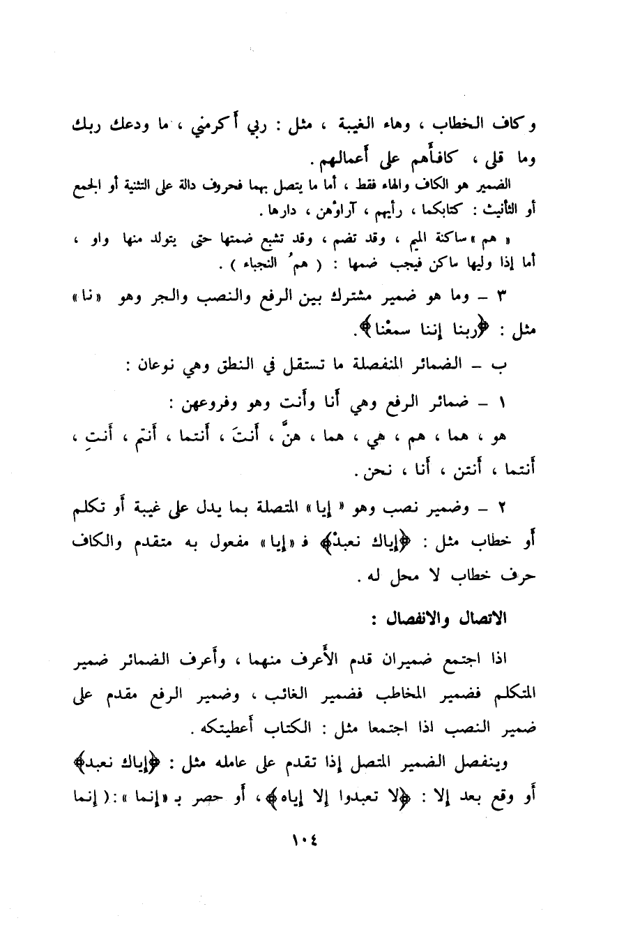 2- وضمير نصب وهو "إيا" المتصلة بما يدل على غيبة أو تكلم أَو خطاب مثل: {إِيّاكَ نَعْبُدُ} فـ"إيا" مفعول به متقدم والكاف حرف خطاب لا محل له.