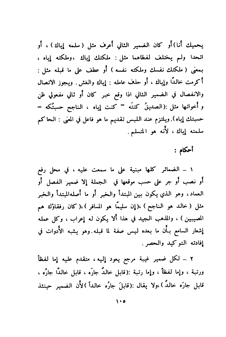 1- الضمائر كلها مبنية على ما سمعت عليه، في محل رفع أو نصب أو جر على حسب موقعها في الجملة إلا ضمير الفصل أو العماد، وهو الذي يكون بين المبتدأ والخبر أو ما أَصله المبتدأ والخبر مثل "خالد هو الناجح"، "إن سليماً هو المسافر"، "كان رفقاؤك هم المصيبين"، والمذهب الجيد في هذا ألا يكون له إعراب، وكل عمله إشعار السامع بأَن ما بعده ليس صفة لما قبله، وهو يشبه الأَدوات في إفادته التوكيد والحصر.