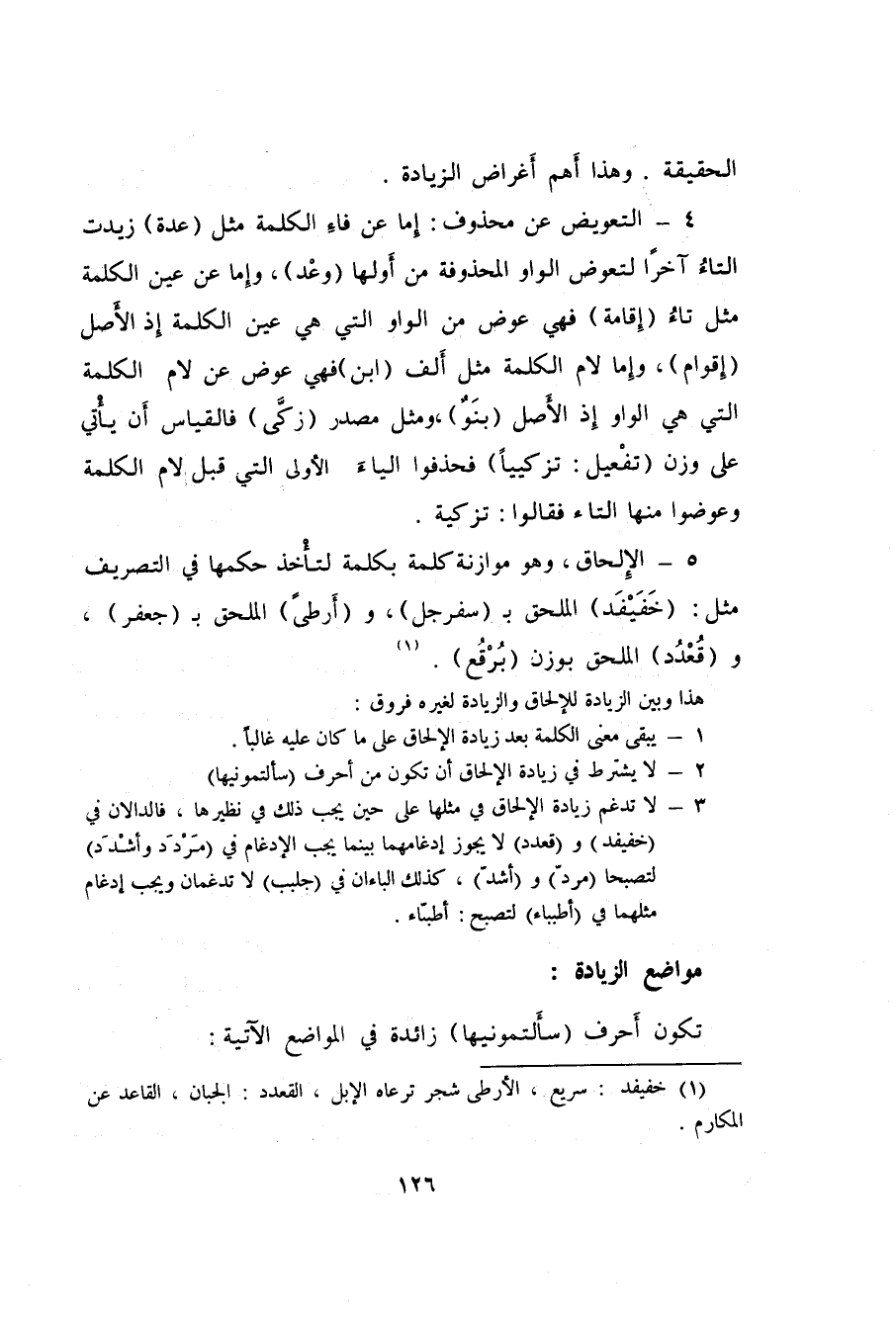 5- الإِلحاق، وهي موازنة كلمة بكلمة لتأْخذ حكمها في التصريف مثل: "خَفَيْفَد" الملحق بـ"سفرجل"، و"أَرطىً" الملحق بـ"جعفر"، و"قُعْدُد" الملحق بوزن "بُرْقُع"1.