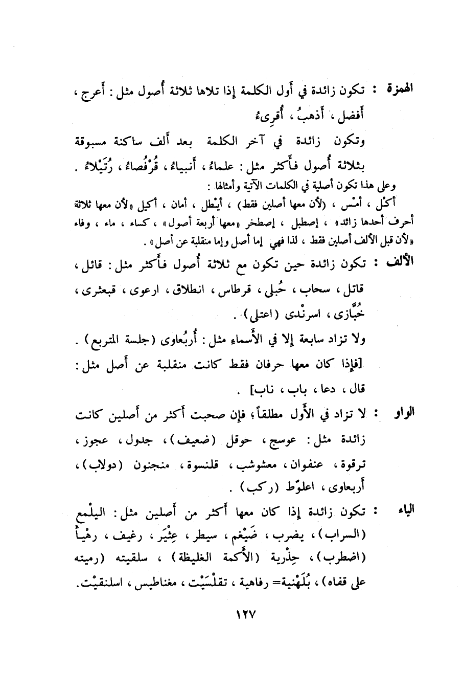 الألف: تكون زائدة حين تكون مع ثلاثة أُصول فأكثر مثل: قائل، قاتل، سحاب، حُبلى، قرطاس، انطلاق، ارعوى، قبعثرى، خُبَّازى، اسرنْدى "اعتلى".
