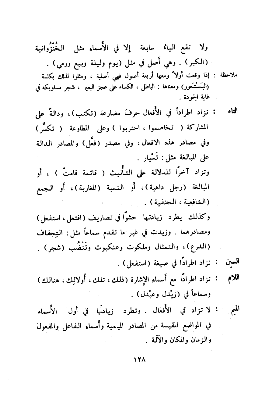 التاء: تزاد اطراداً في الأَفعال حرفَ مضارعة "تكتب"، ودالةً على المشاركة "تخاصموا، احتربوا" وعلى المطاوعة "تكسَّر" وفي مصادر هذه الأفعال، وفي مصدر "فعَّل" والمصادر الدالة على المبالغة مثل: تَسْيار.