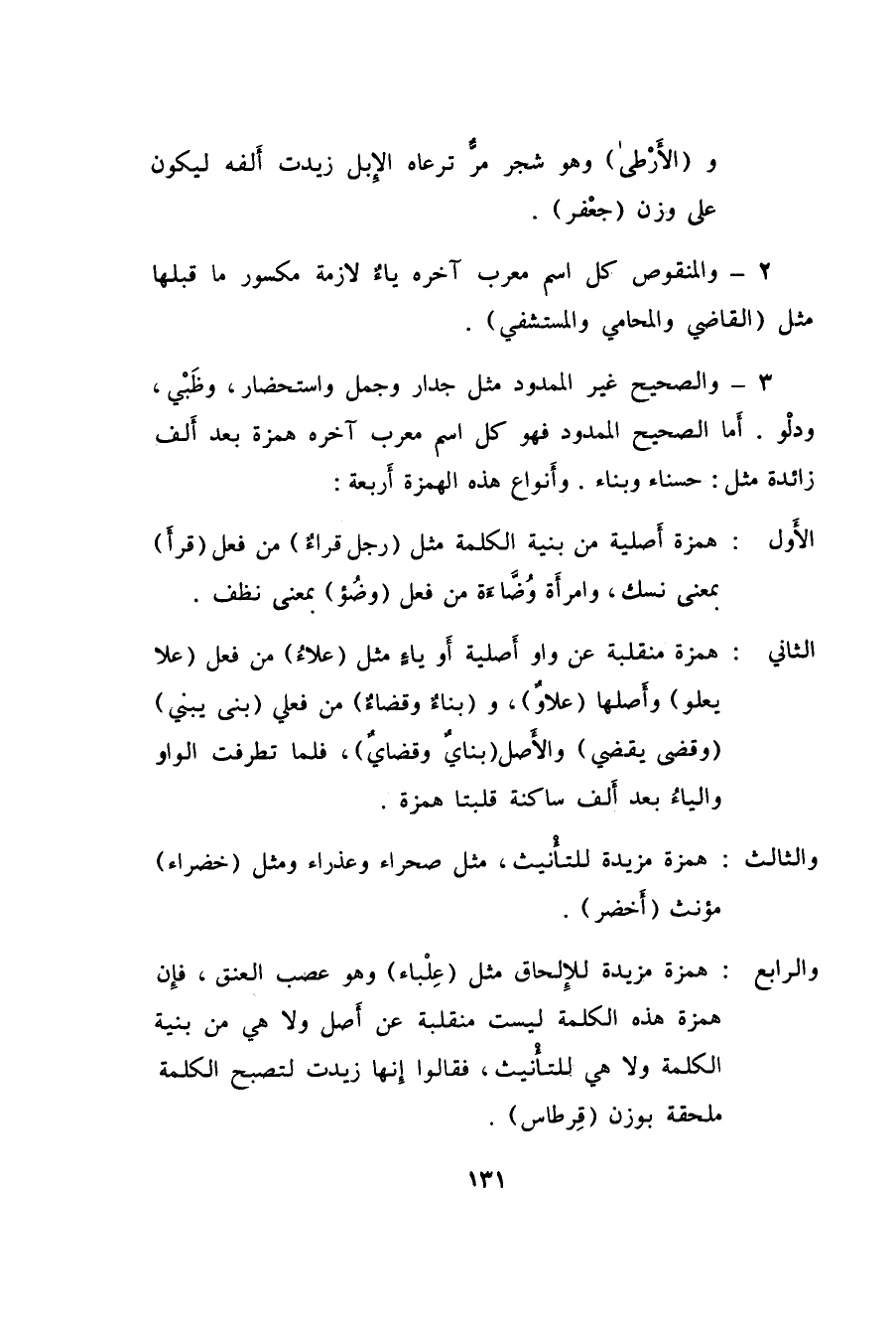3- والصحيح غير الممدود مثل جدار وجمل واستحضار، وظَبْي، ودلْو. أَما الصحيح الممدود فهو كل اسم معرب آخره همزة بعد ألف زائدة مثل: حسناء وبناء. وأَنواع هذه الهمزة أَربعة: