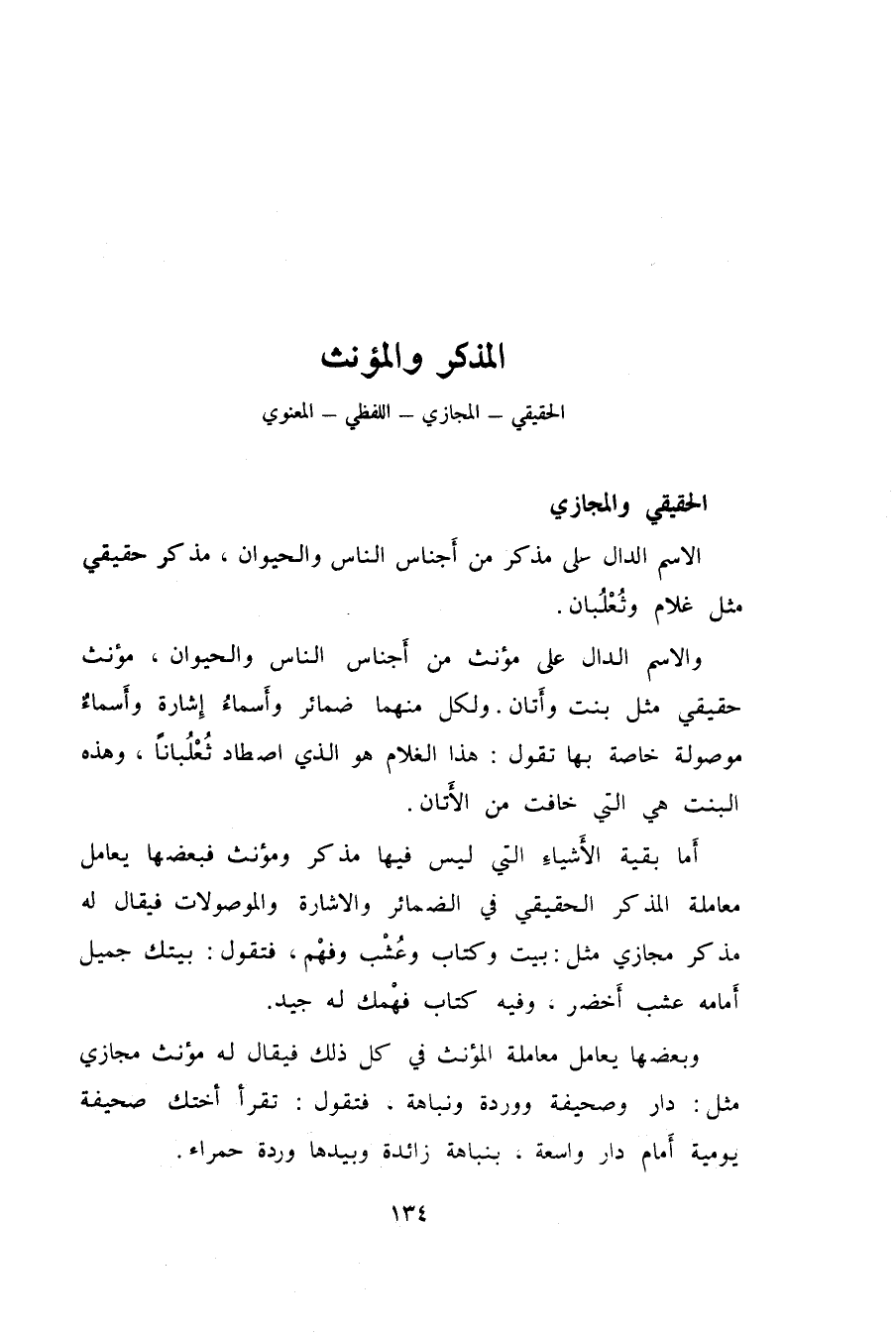 أَما بقية الأشياءِ التي ليس فيها مذكر ومؤنث فبعضها يعامل معاملة المذكر الحقيقي في الضمائر والإشارة والموصولات فيقال له مذكر مجازي مثل: بيت وكتاب وعُشْب وفهْم، فتقول: بيتك جميل أَمامه عشب أخضر، وفيه كتاب فهْمك له جيد.