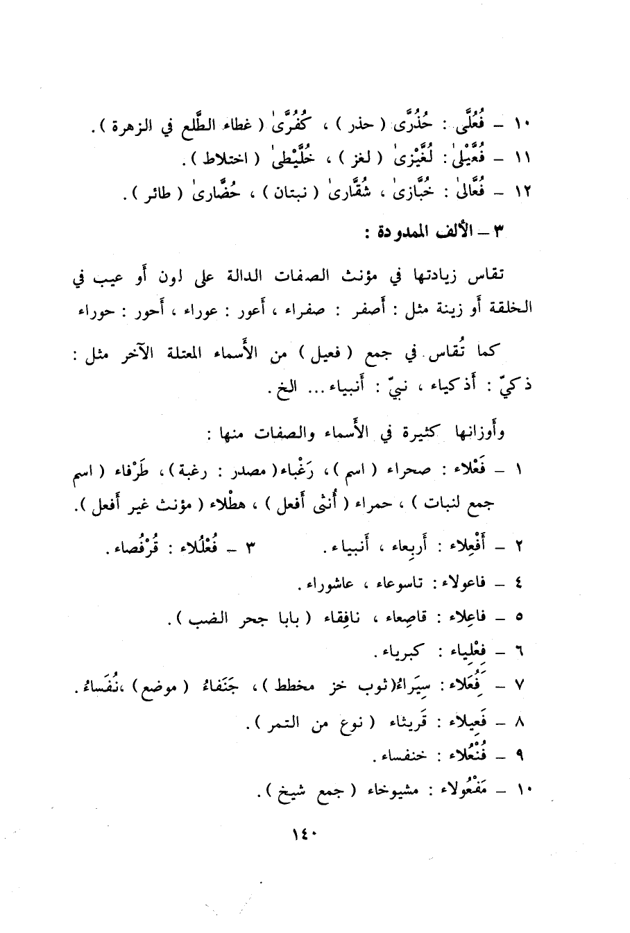 7- فَعُلاء: سِيَراءُ "ثوب خز مخطط"، جَنَفاءُ "موضع"، نُفَساءُ.
