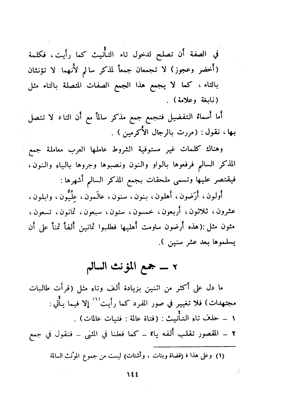 في الصفة أن تصلح لدخول تاء التأْنيث كما رأَيت، فكلمة "أَخضر وعجوز" لا تجمعان جمعاً لمذكر سالم لأَنهما لا تؤنثان بالتاء، كما لا يجمع هذا الجمع الصفات المتصلة بالتاء مثل "نابغة وعلامة".