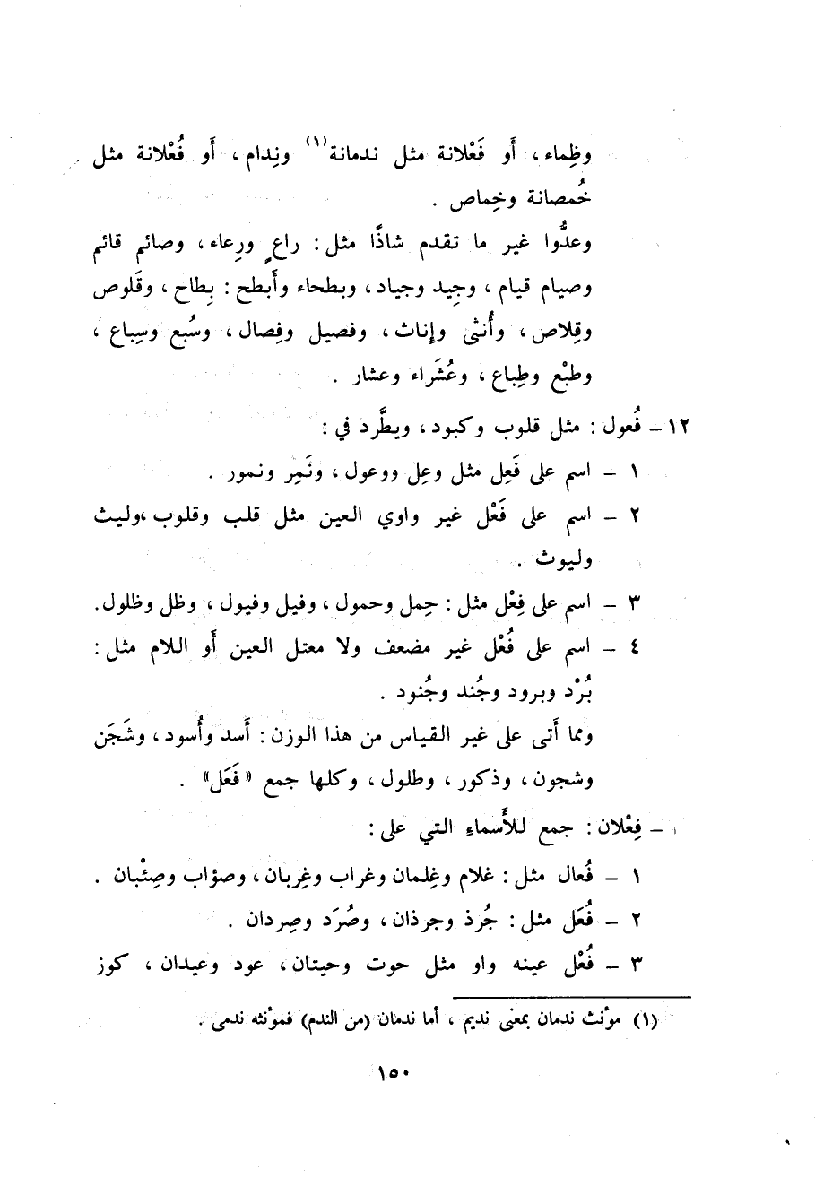 وعدُّوا غير ما تقدم شاذاً مثل: راعٍ ورِعاء، وصائم قائم وصيام قيام، وجِيد وجياد، وبطحاء وأبطح: بِطاح، وقَلوص وقِلاص، وأُنثى وإِناث، وفصيل وفِصال، وسُبع وسِباع، وطبْع وطِباع، وعُشَراء وعشار.