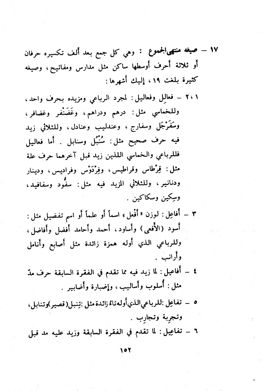 17- صيغه منتهى الجموع: وهي كل جمع بعد أَلف تكسيره حرفان أو ثلاثة أحرف أوسطها ساكن مثل مدارس ومفاتيح، وصيغه كثيرة بلغت 19، إليك أشهرها: