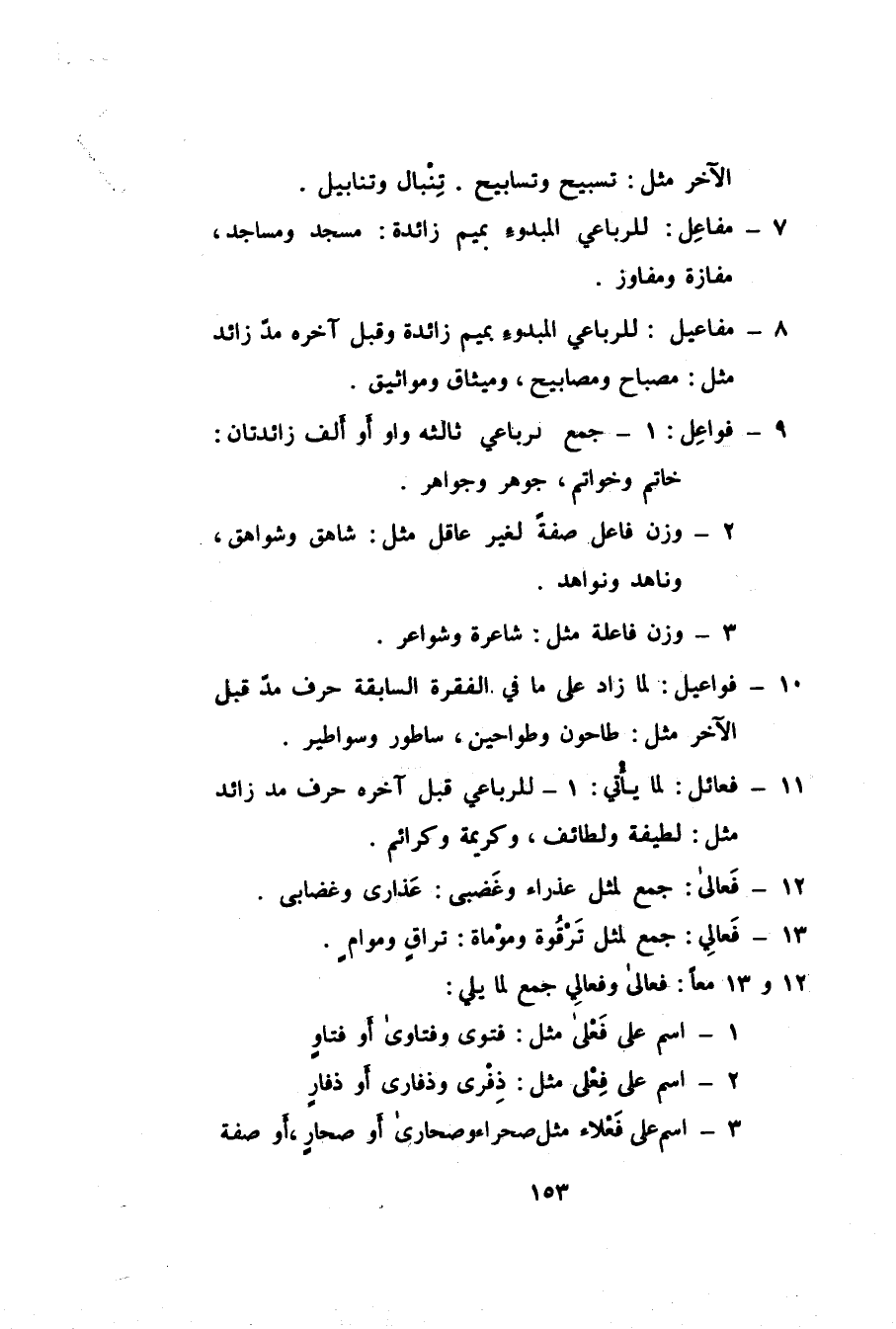 10- فواعيل: لما زاد على ما في الفقرة السابقة حرف مدّ قبل الآخر مثل: طاحون وطواحين، ساطور وسواطير.