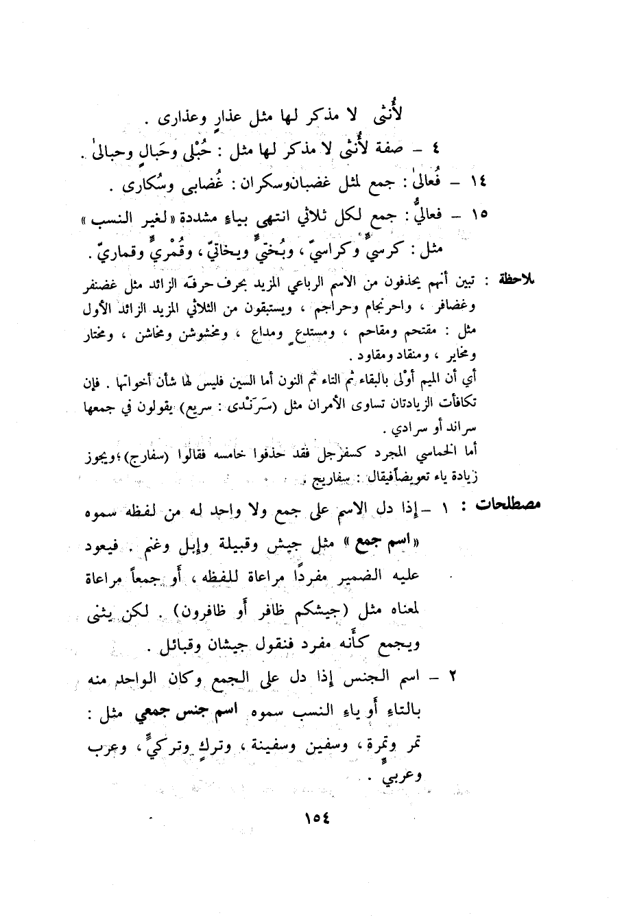 مصطلحات: 1- إن دل الاسم على جمع ولا واحد له من لفظه سموه "اسم جمع" مثل جيش وقبيلة وإبل وغنم، فيعود عليه الضمير مفرداً مراعاة للفظة، أَو جمعاً مراعاة لمعناه مثل "جيشكم ظافر أَو ظافرون". لكن يثنى ويجمع كأَنه مفرد فنقول جيشان وقبائل.