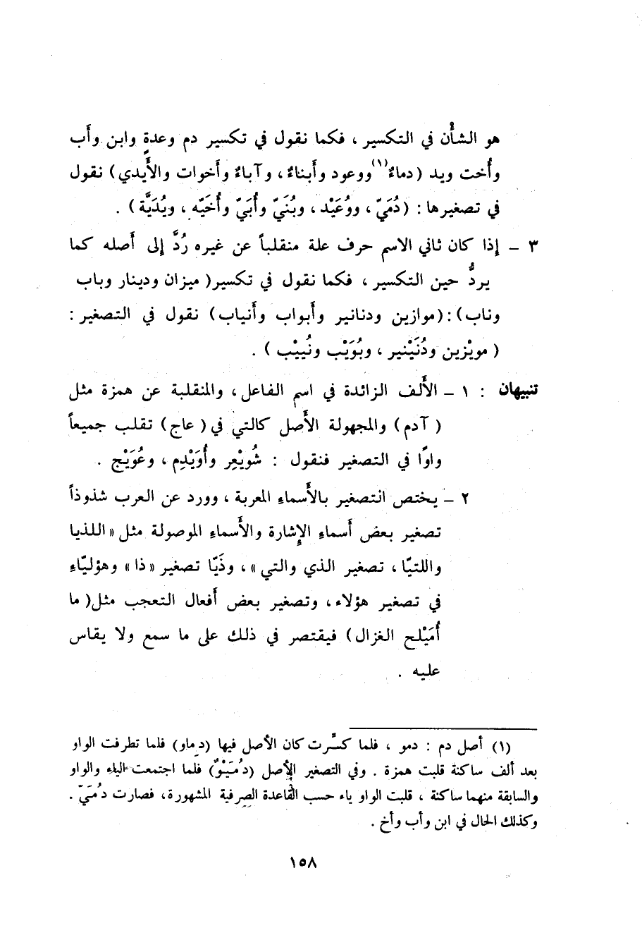 1- أصل دم: دمو، فلما كسِّرت كان الأصل فيها "دِماو" فلما تطرفت الواو بعد ألف ساكنة قلبت همزة. وفي التصغير الأصل "دُمَيْوٌ" فلما اجتمعت الياء والواو والسابقة منهما ساكنة، قلبت الواو ياء حسب القاعدة الصرفية المشهورة، فصارت دُمَيّ. وكذلك الحال في ابن وأب وأخ.