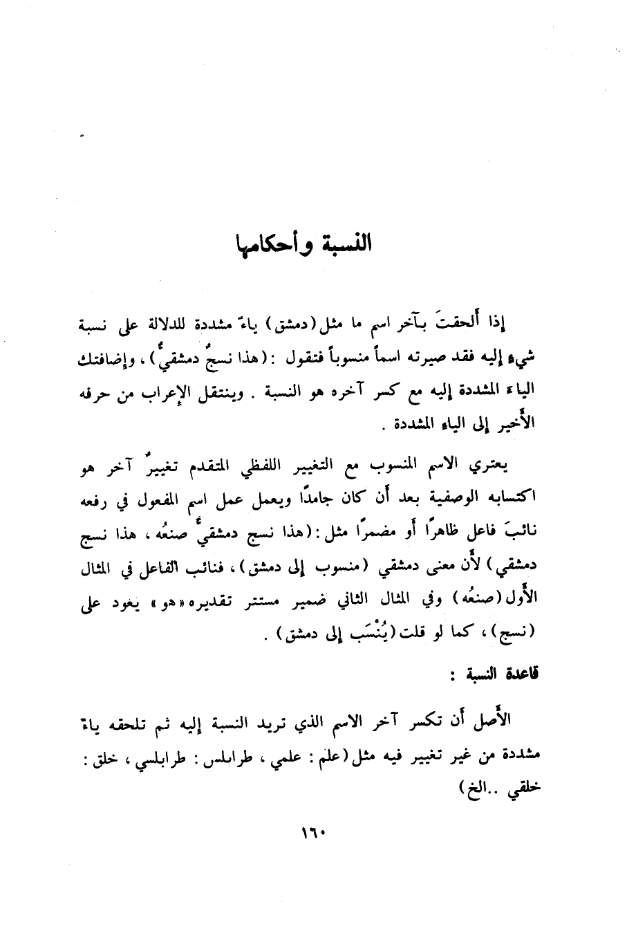 إذا أَلحقتَ بآخر اسم ما مثل "دمشق" ياء مشددة للدلالة على نسبة شيءٍ إليه فقد صيرته اسماً منسوباً فتقول: "هذا نسجٌ دمشقيٌّ"، وإضافتك الياءَ المشددة إِليه مع كسر آخره هو النسبة. وينتقل الإِعراب من حرفه الأخير إلى الياء المشددة.