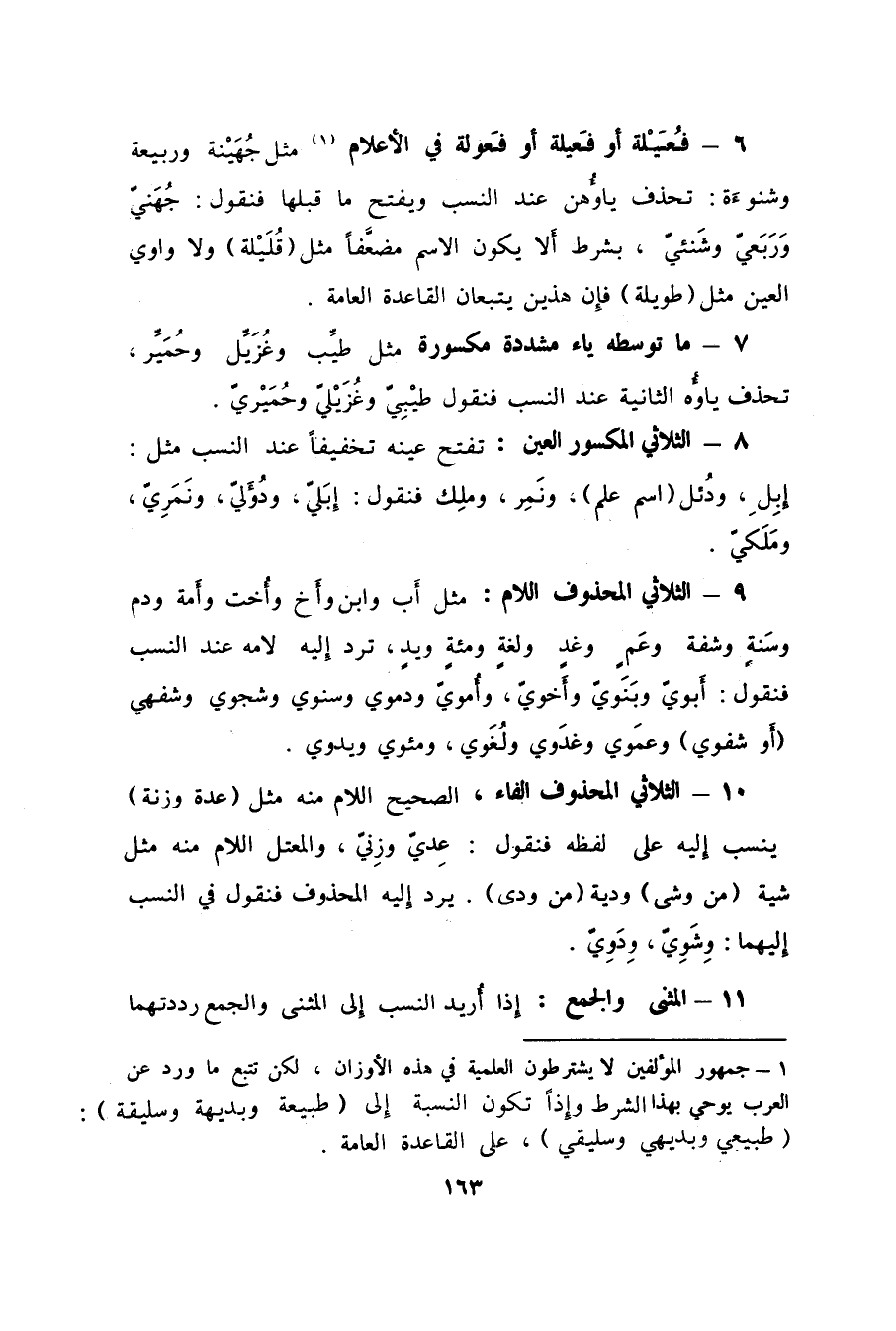 9- الثلاثي المحذوف اللام: مثل أَب وابن وأَخ وأُخت وأَمة ودم وسَنةٍ وشفة وعَمٍ وغدٍ ولغةٍ ومئةٍ ويدٍ، ترد غِليه لامه عند النسب فنقول: أَبويّ وبَنَويّ وأَخويّ، وأُمويّ ودموي وسنوي وشجوي وشفهي "أَو شفوي" وعمَوي وغدَوي ولُغَوي، ومئوي ويدوي.