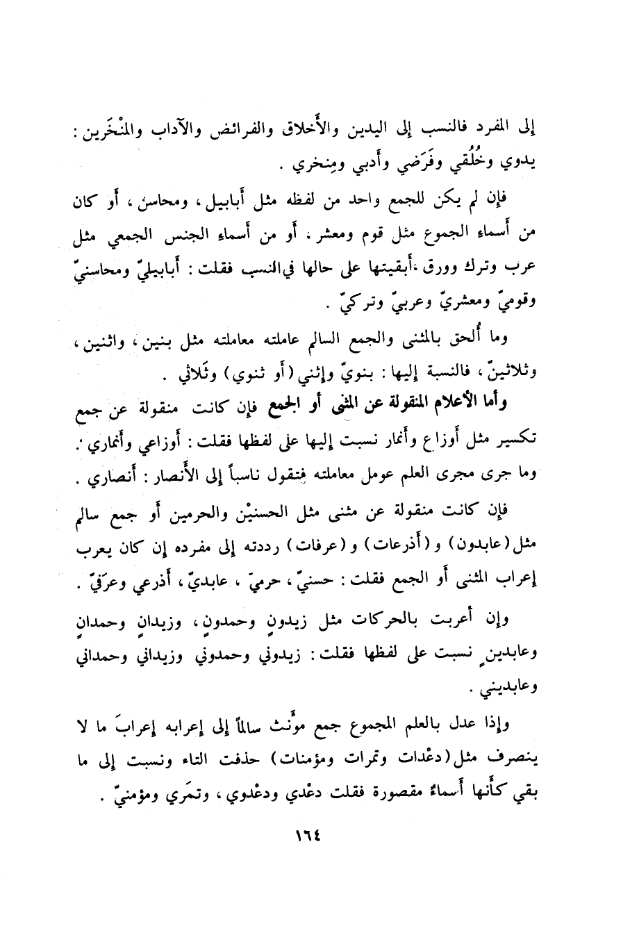 فإن لم يكن للجمع واحد من لفظه مثل أَبابيل، ومحاسن، أَو كان من أَسماء الجموع مثل قوم ومعشر، أَو من أَسماءِ الجنس الجمعي مثل عرب وترك وورق، أَبقيتها على حالها في النسب فقلت: أَبابيليّ ومحاسنيّ وقوميّ ومعشريّ وعربيّ وتركيّ.