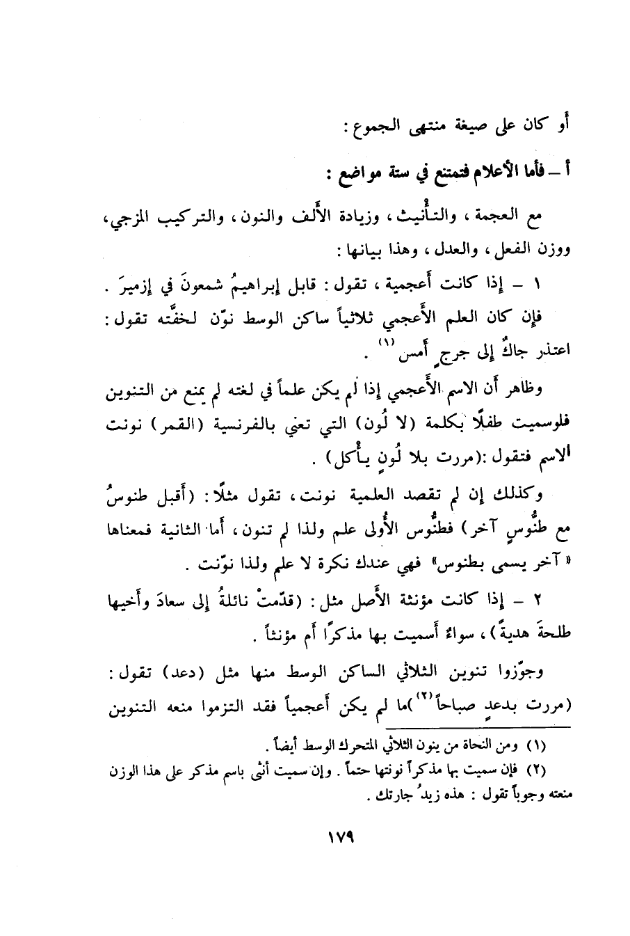 1- إذا كانت أعجمية، تقول: قابل إِبراهيمُ شمعونَ في إِزميرَ. فإِن كان العلم الأَعجمي ثلاثياً ساكن الوسط نوّن لخفَّته تقول: اعتذر جاكٌ إِلى جرجٍ أَمس1.