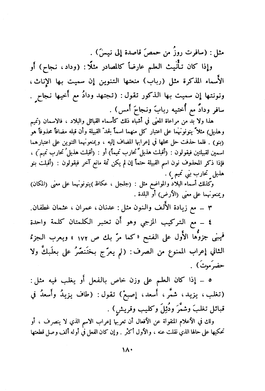 5- إِذا كان العلم على وزن خاص بالفعل أَو يغلب فيه مثل: "تغلب، يزيد، شمَّر، أَسعد، إِصبعْ" تقول: "طاف يزيدُ وأَسعدُ في قبائل تغلبَ وشمَّرَ ودُئِلَ وكليب وقريشٍ".