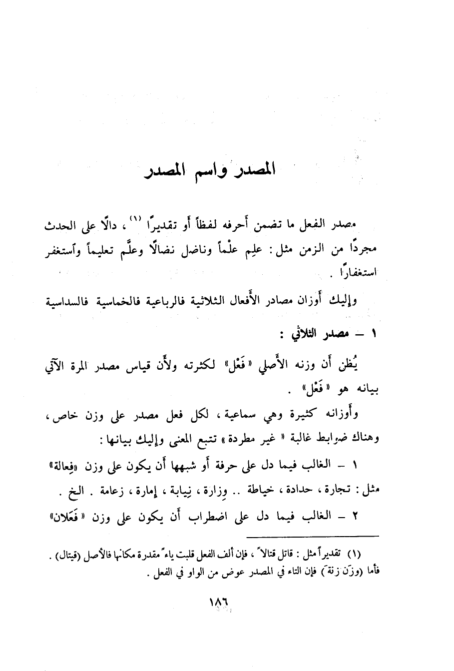 مصدر الفعل ما تضمن أَحرفه لفظاً أَو تقديراً1، دالاً على الحدث مجرداً من الزمن مثل: علِم علْماً وناضل نضالاً وعلَّم تعليماً واستغفر استغفاراً.