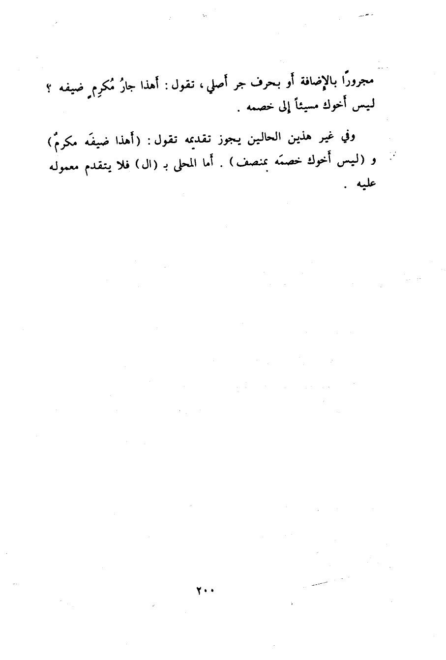 وفي غير هذين الحالين يجوز تقديمه تقول: "أَهذا ضيفَه مكرمٌ" و"ليس أَخوك خصمَه بمنصف". أَما المحلى بـ"ال" فلا يتقدم معموله عليه.