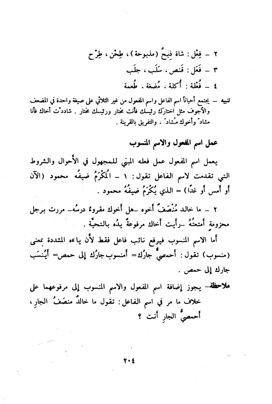 ملاحظة: يجوز إضافة اسم المفعول والاسم المنسوب إِلى مرفوعهما على خلاف ما مر في اسم الفاعل: تقول ما خالدٌ منصَفُ الجارِ، أَحمصيُّ الجارِ أَنت؟