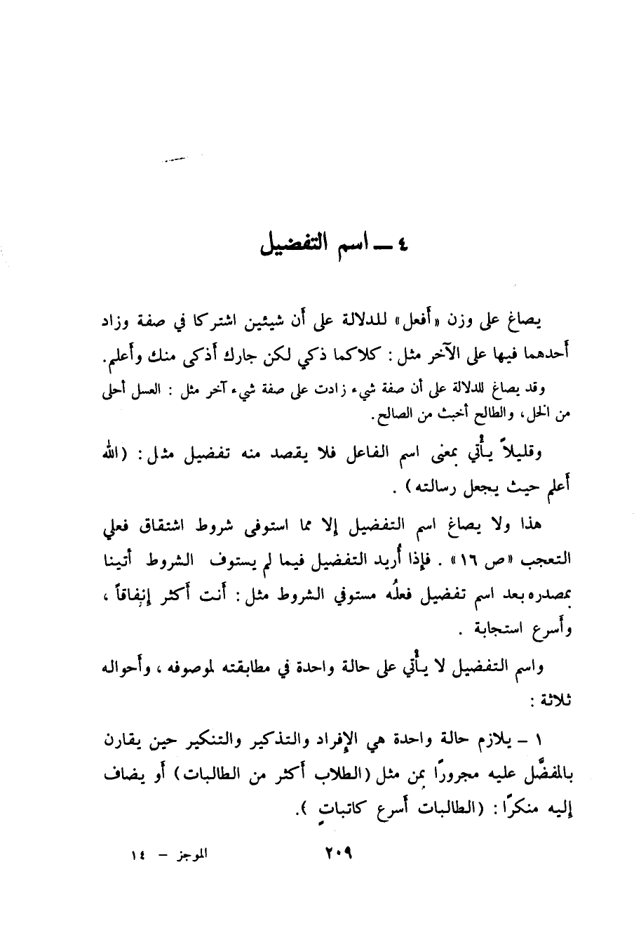 هذا ولا يصاغ اسم التفضيل إلا مما استوفى شروط اشتقاق فعلي التعجب "ص16". فإِذا أُريد التفضيل فيما لم يستوف الشروط أتينا بمصدره بعد اسم تفضيل فعلُه مستوفي الشروط مثل: أَنت أَكثر إنفاقاً، وأَسرع استجابة.