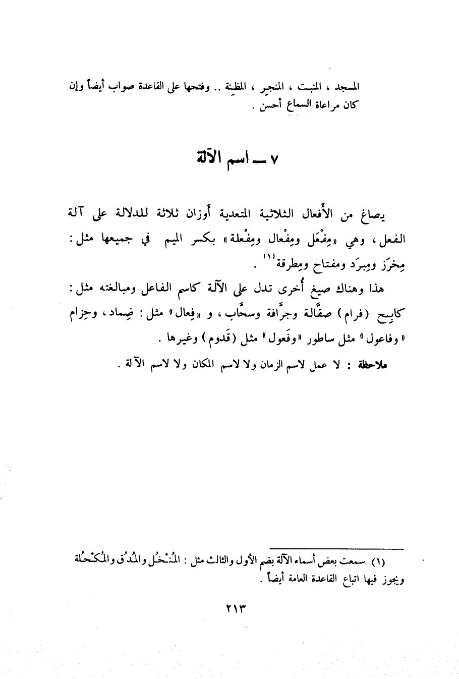 يصاغ من الأَفعال الثلاثية المتعدية أَوزان ثلاثة للدلالة على آلة الفعل، وهي "مِفْعَل ومِفْعال ومِفْعلة" بكسر الميم في جميعها مثل: مِخرَز ومِبرَد ومفتاح ومِطرقة1.