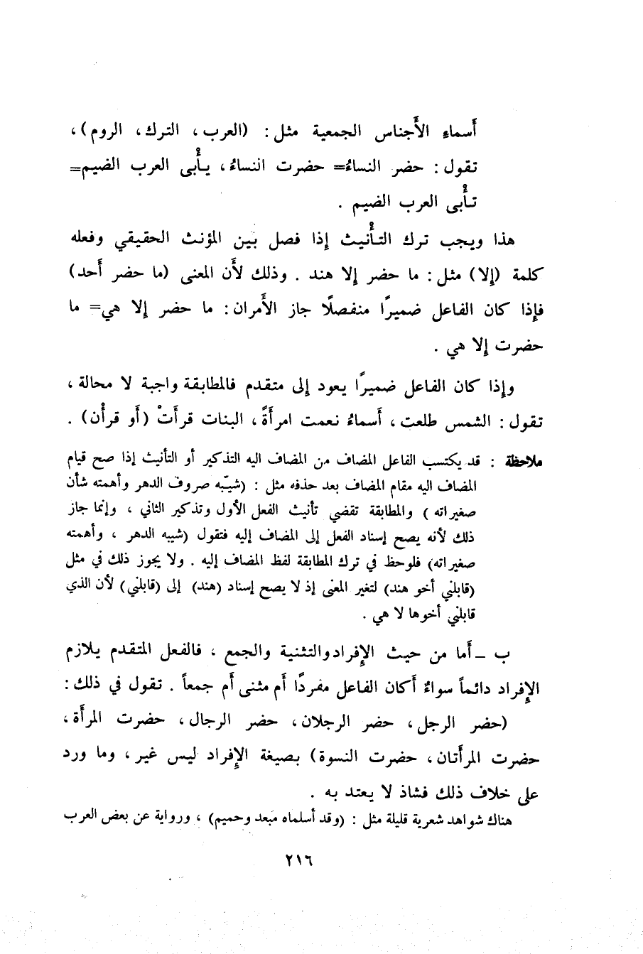 هذا ويجب ترك التأْنيث إِذا فصل بين المؤنث الحقيقي وفعله كلمة "إِلا" مثل: ما حضر إِلا هند. وذلك لأَن المعنى "ما حضر أحد" فإِذا كان الفاعل ضميراً منفصلاً جاز الأَمران: ما حضر إِلا هي = ما حضرت إِلا هي.