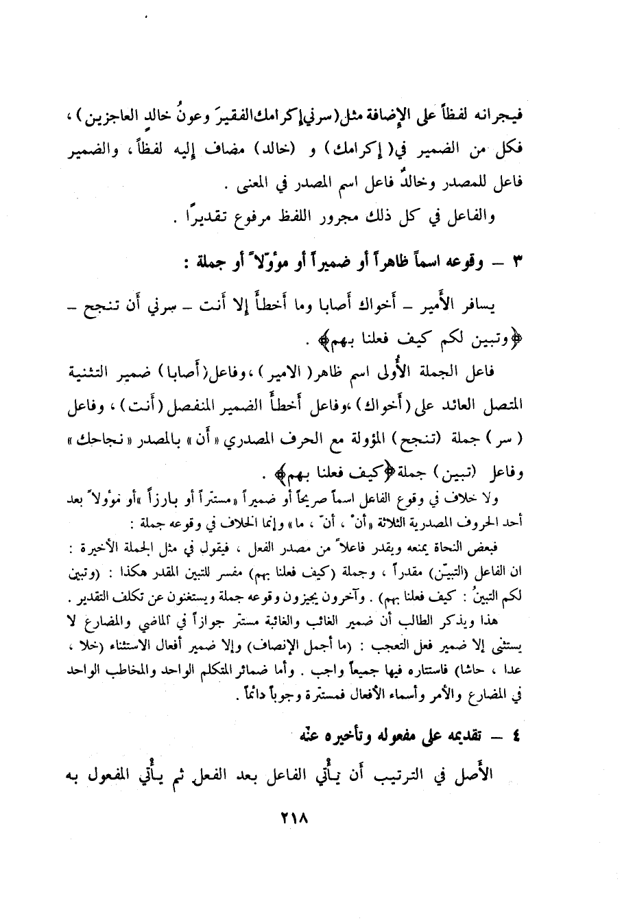 فاعل الجملة الأُولى اسم ظاهر "الأمير"، وفاعل "أَصابا" ضمير التثنية المتصل العائد على "أَخواك"، وفاعل أَخطأَ الضمير المنفصل "أَنت"، وفاعل "سر" جملة "تنجح" المؤولة مع الحرف المصدري "أَن" بالمصدر "نجاحك" وفاعل "تبين" جملة {كَيْفَ فَعَلْنا بِهِمْ} .