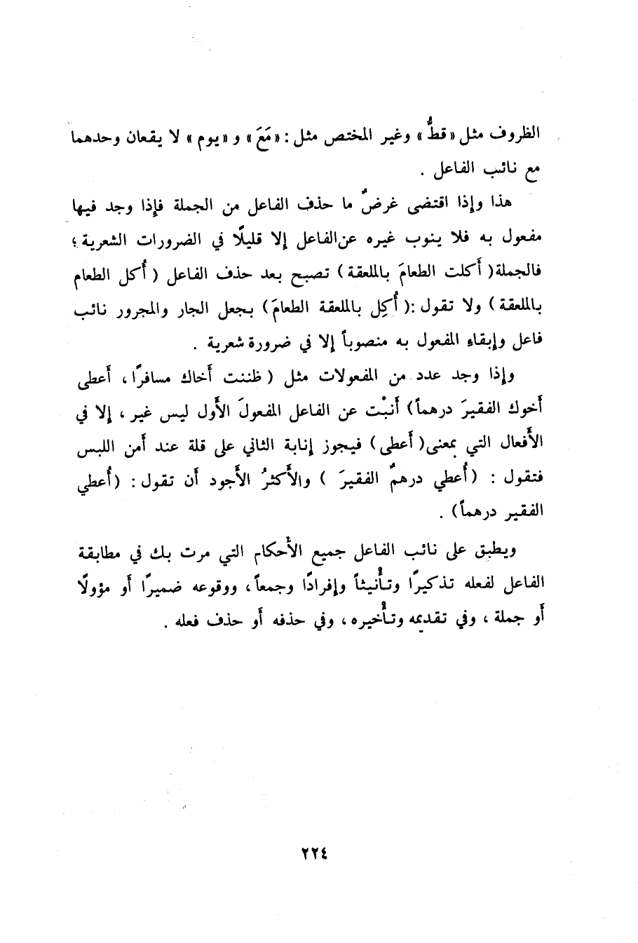 هذا وإذا اقتضى غرضٌ ما حذف الفاعل من الجملة فإِذا وجد فيها مفعول به فلا ينوب غيره عن الفاعل إلا قليلاً في الضرورات الشعرية، فالجملة "أَكلت الطعامَ بالملعقة" تصبح بعد حذف الفاعل "أُكل الطعام بالملعقة" ولا تقول: "أُكِل بالملعقة الطعامَ" بجعل الجار والمجرور نائب فاعل وإبقاءِ المفعول به منصوباً إلا في ضرورة شعرية.