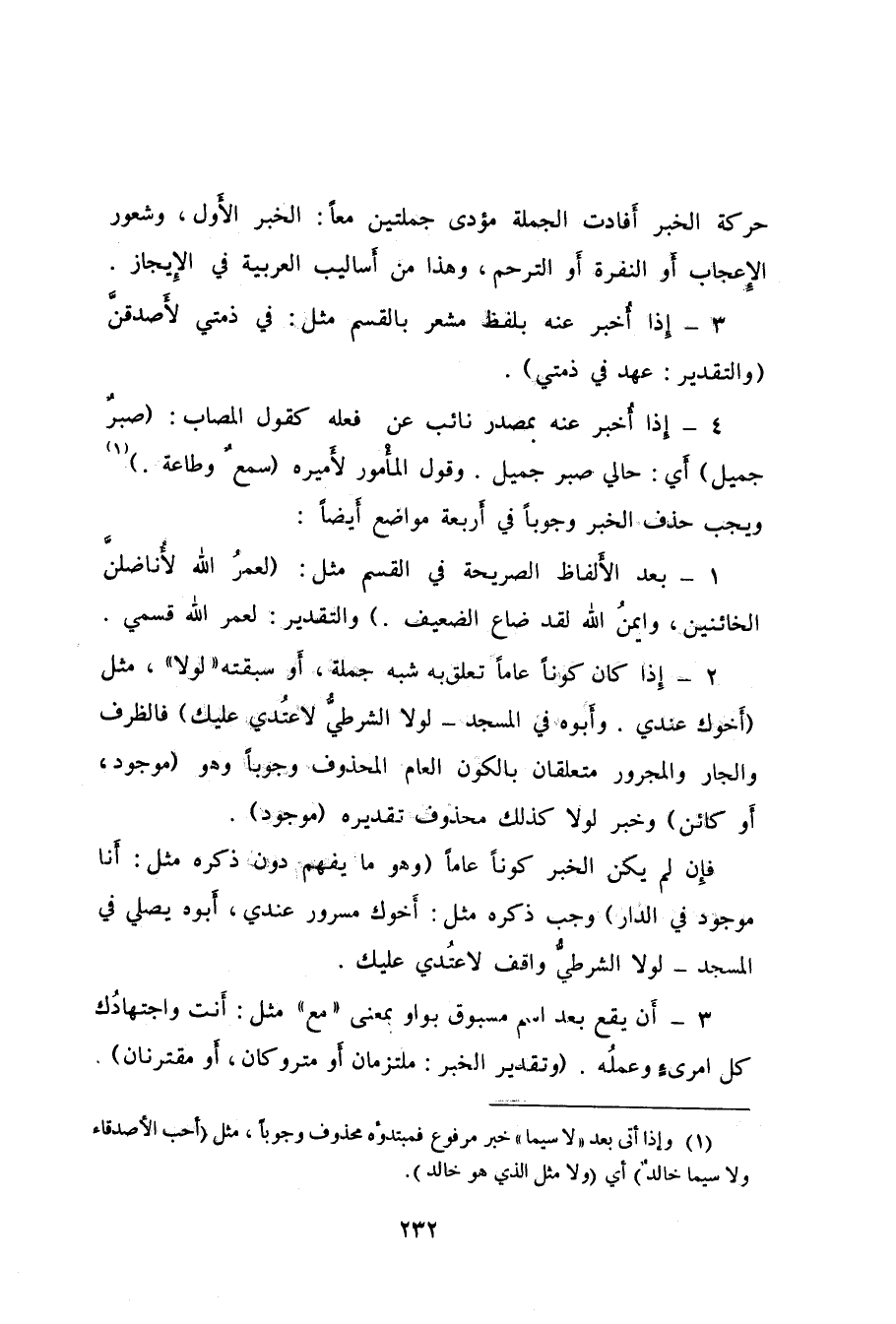 4- إِذا أُخبر عنه بمصدر نائب عن فعله كقول المصاب: "صبرٌ جميل" أي: حالي صبر جميل. وقول المأَمور لأَميره "سمعٌ وطاعة"1. ويجب حذف الخبر وجوباً في أَربعة مواضع أَيضاً: