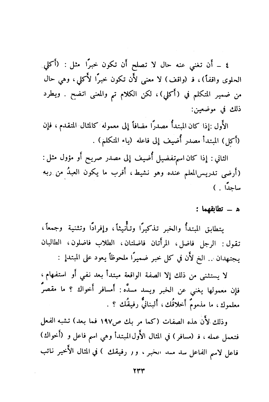 وذلك لأَن هذه الصفات "كما مر بك ص197 فما بعد" تشبه الفعل فتعمل عمله، فـ"مسافر" في المثال الأَول المبتدأ وهي اسم فاعل و"أَخواك" فاعل لاسم الفاعل سد مسد الخبر، و"رفيقك" في المثال الأخير نائب