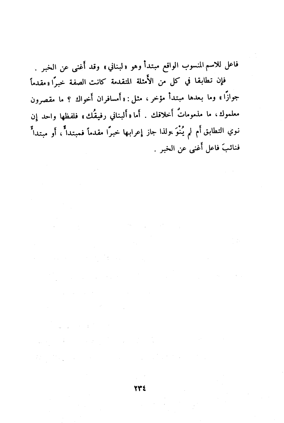 فإن تطابقا في كل من الأَمثلة المتقدمة كانت الصفة خبراً "مقدماً جوازاً" وما بعدها مبتدأ مؤخر، مثل: "أَمسافران أَخواك؟ " ما مقصرون معلموك، ما مذموماتٌ أخلاقك. أَما "أَلبناني رفيقُك" فلفظها واحد إن نوي التطابق أَم لم يُنْوَ، ولذا جاز إعرابهما خبراً مقدماً فمبتدأً، أو مبتدأً فنائبَ فاعل أغنى عن الخبر.