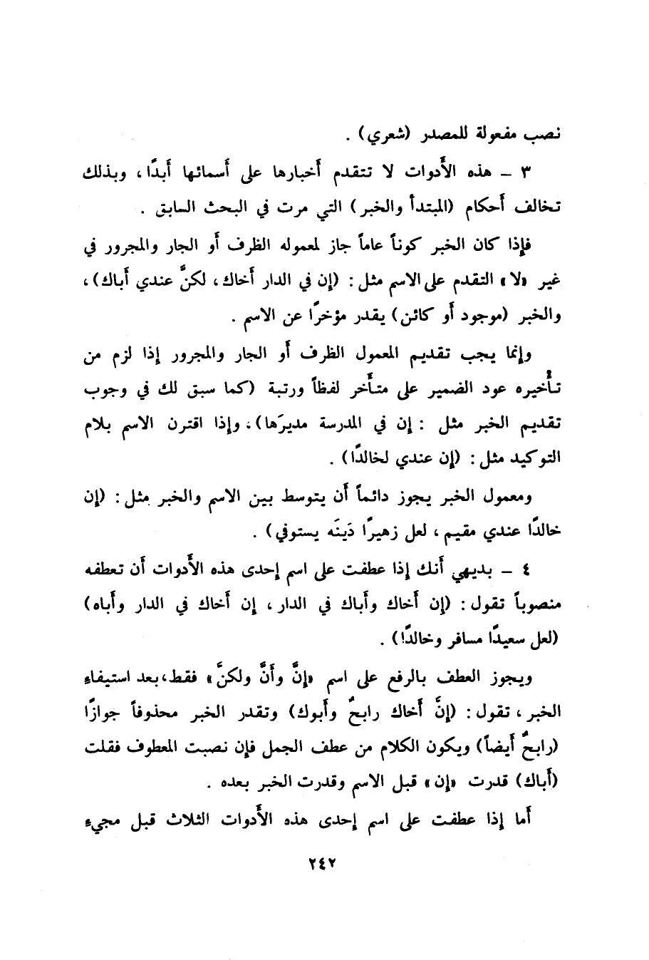 4- بديهي أَنك إذا عطفت على اسم إِحدى هذه الأَدوات أَن تعطفه منصوباً تقول: "إن أَخاك وأَباك في الدار، إِن أَخاك في الدار وأَباه" "لعل سعيداً مسافر وخالداً".