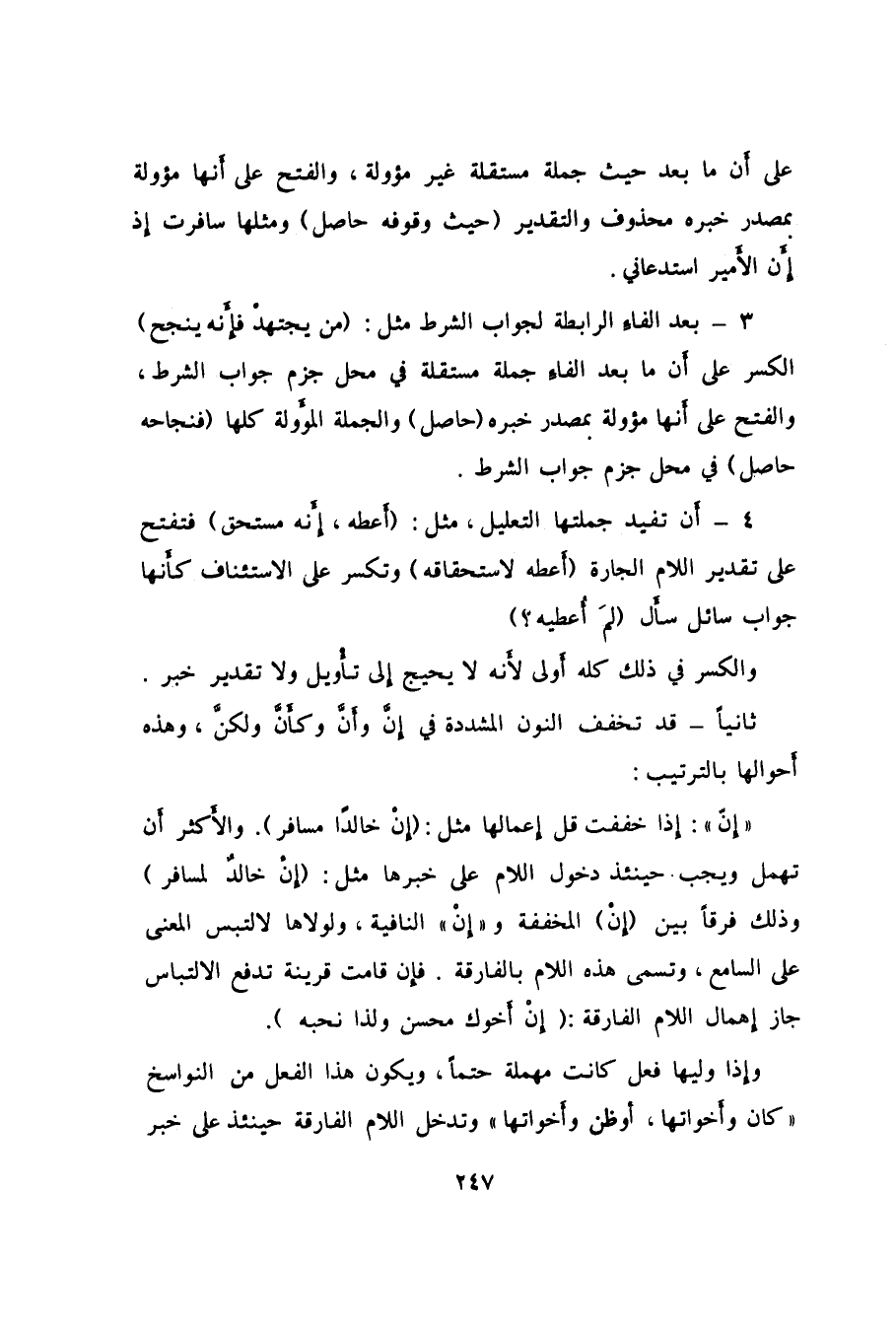 3- بعد الفاءِ الرابطة لجواب الشرط مثل: "من يجتهدْ فإِنه ينجح" الكسر على أَن ما بعد الفاءِ جملة مستقلة في محل جزم جواب الشرط، والفتح على أَنها مؤولة بمصدر خبره "حاصل" والجملة المؤَولة كلها "فنجاحه حاصل" في محل جزم جواب الشرط".