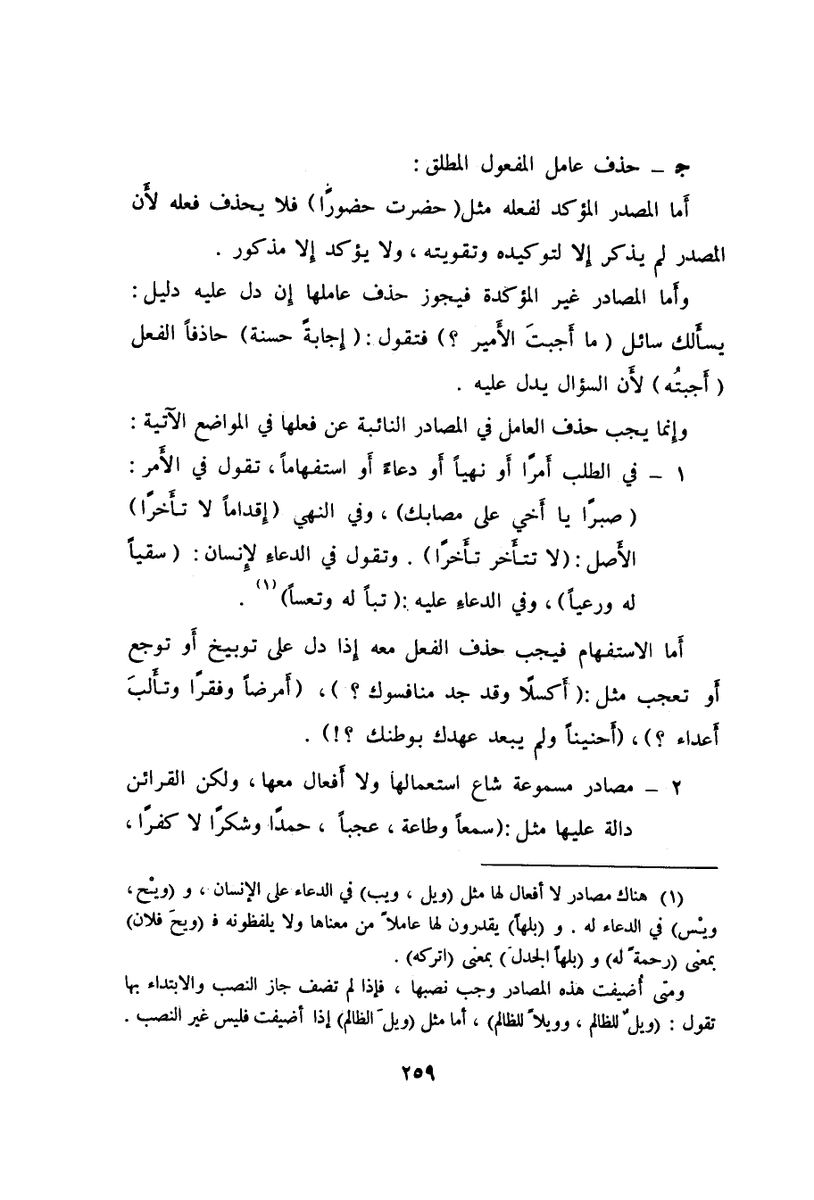 وإنما يجب حذف العامل في المصادر النائبة عن فعلها في المواضع الآتية: