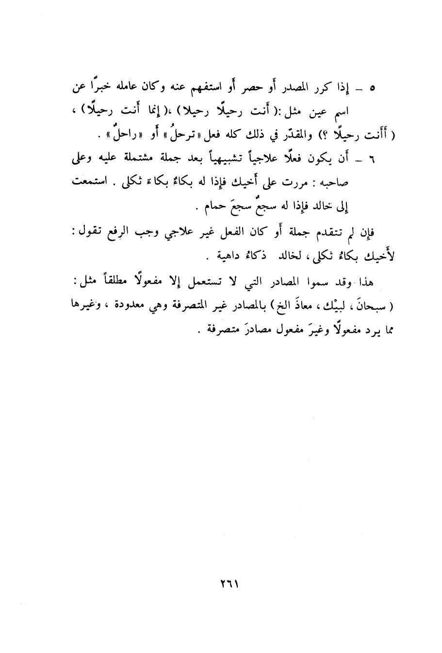 5- إِذا كرر المصدر أَو حصر أَو استفهم عنه وكان عامله خبراً عن اسم عين مثل: "أَنت رحيلاً رحيلاً"، "إنما أَنت رحيلاً"، "أَأَنت رحيلاً؟ " والمقدّر في ذلك كله فعل "ترحلُ" أَو "راحلٌ".