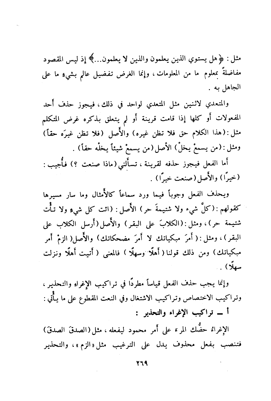 وإنما يجب حذف الفعل قياساً مطرداً في تراكيب الإِغراءِ والتحذير، وتراكيب الاختصاص وتراكيب الاشتغال وفي النعت المقطوع على ما يأْتي: