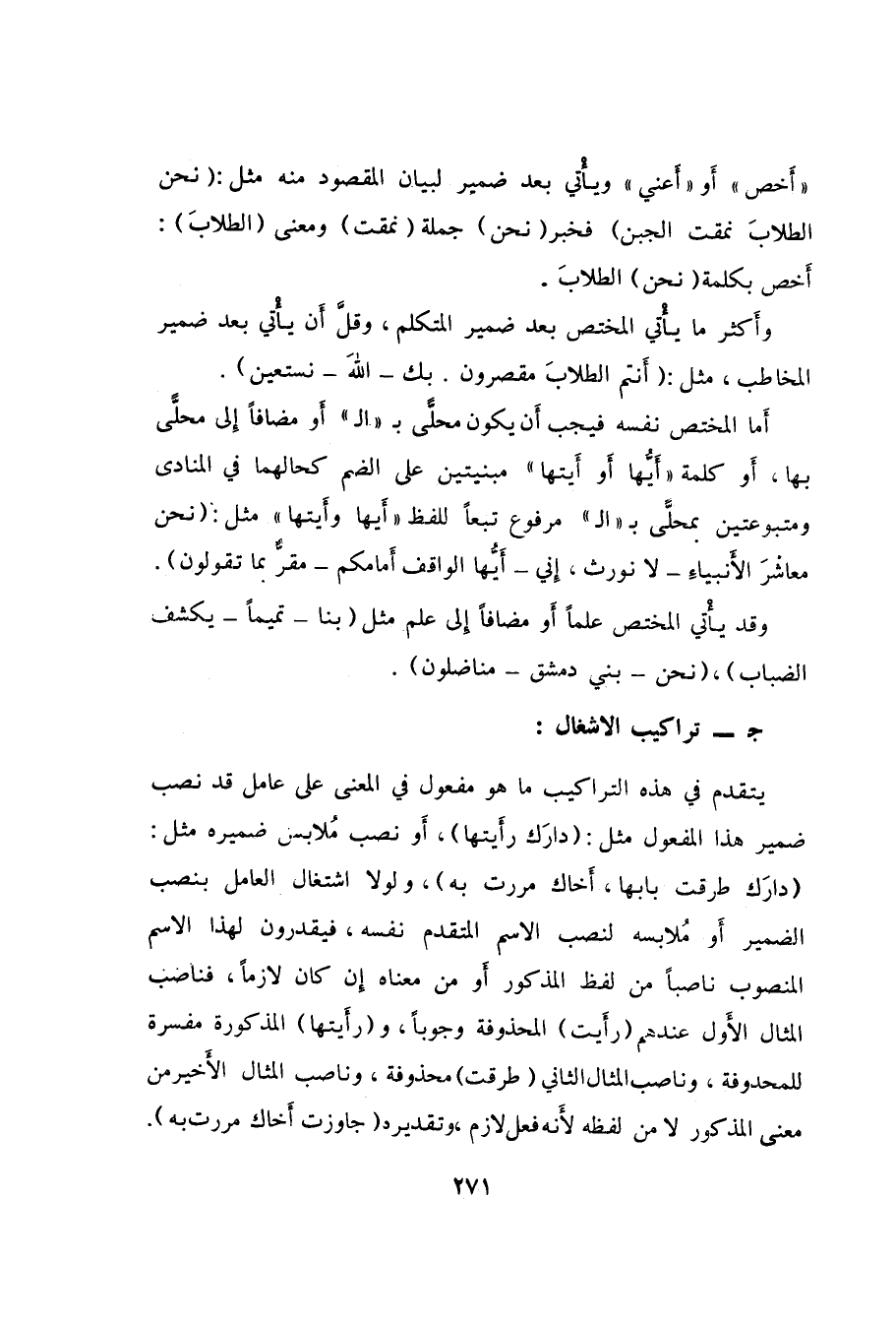 "أَخص" أَو "أَعني" ويأْتي بعد ضمير لبيان المقصود منه مثل: "نحن الطلابَ نمقت الجبن" فخبر "نحن" جملة "نمقت" ومعنى "الطلابَ": أَخص بكلمة "نحن" الطلابَ.
