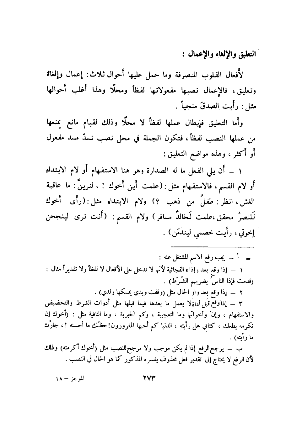 لأَفعال القلوب المتصرفة وما حمل عليها أَحوال ثلاث: إِعمال وإلغاءٌ وتعليق، فالإعمال نصبها مفعولاتها لفظاً ومحلاً، وهذا أَغلب أَحوالها مثل: رأَيت الصدقَ منجياً.