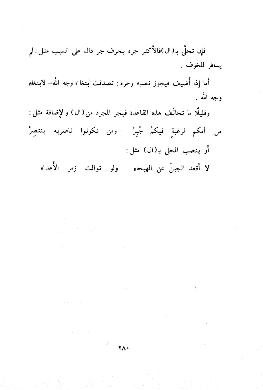 فإن تحلَّى بـ"ال" فالأَكثر جره بحرف جر دال على السبب مثل: لم يسافر للخوف.