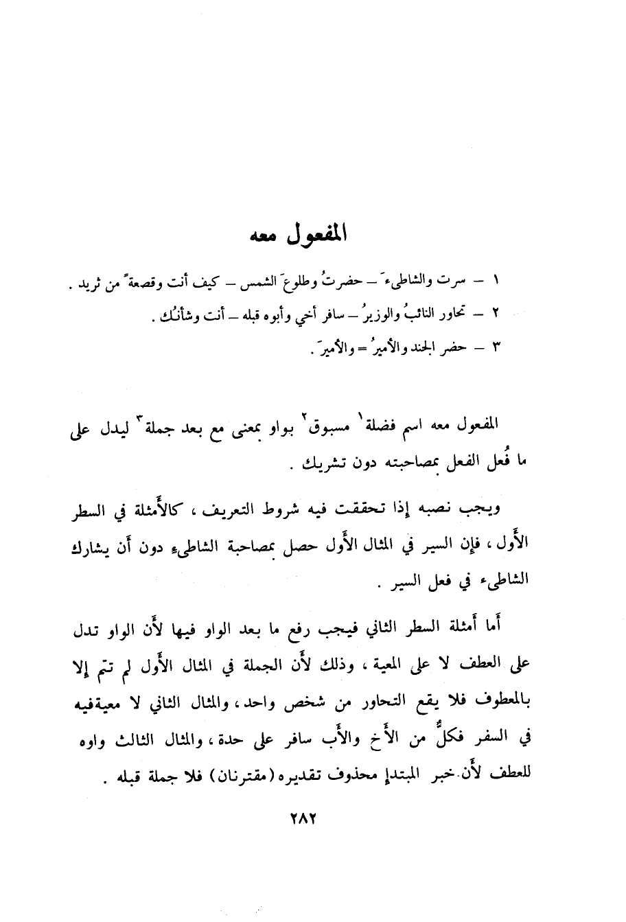 ويجب نصبه إِذا تحققت فيه شروط التعريف، كالأَمثلة في السطر الأَول، فإِن السير في المثال الأَول حصل بمصاحبة الشاطئِ دون أَن يشارك الشاطئ في فعل السير.