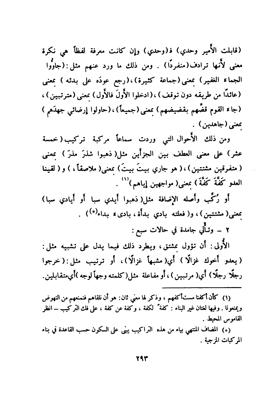 ومن ذلك الأحوال التي وردت سماعاً مركبة تركيب "خمسة عشر" على معنى العطف بين الجزأَين مثل "ذهبوا شذرَ مذرَ" بمعنى "متفرقين مشتتين"، "هو جاري بيتَ بيتَ" بمعنى "ملاصقاً"، و"لقينا العدو كَفَّةَ كَفَّةَ" بمعنى "مواجهين إياهم"1.
