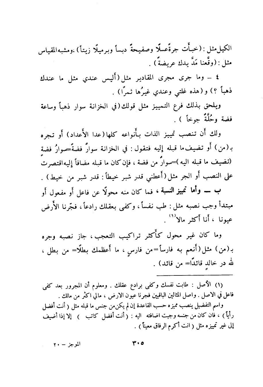 ب- وأما تمييز النسبة، فما كان منه محولاً عن فاعل أَو مفعول أو مبتدأ وجب نصبه مثل: طب نفساً، وكفى بعقلك رادعاً، فجّرنا الأَرض عيوناً، أَنا أَكثر مالاً1.