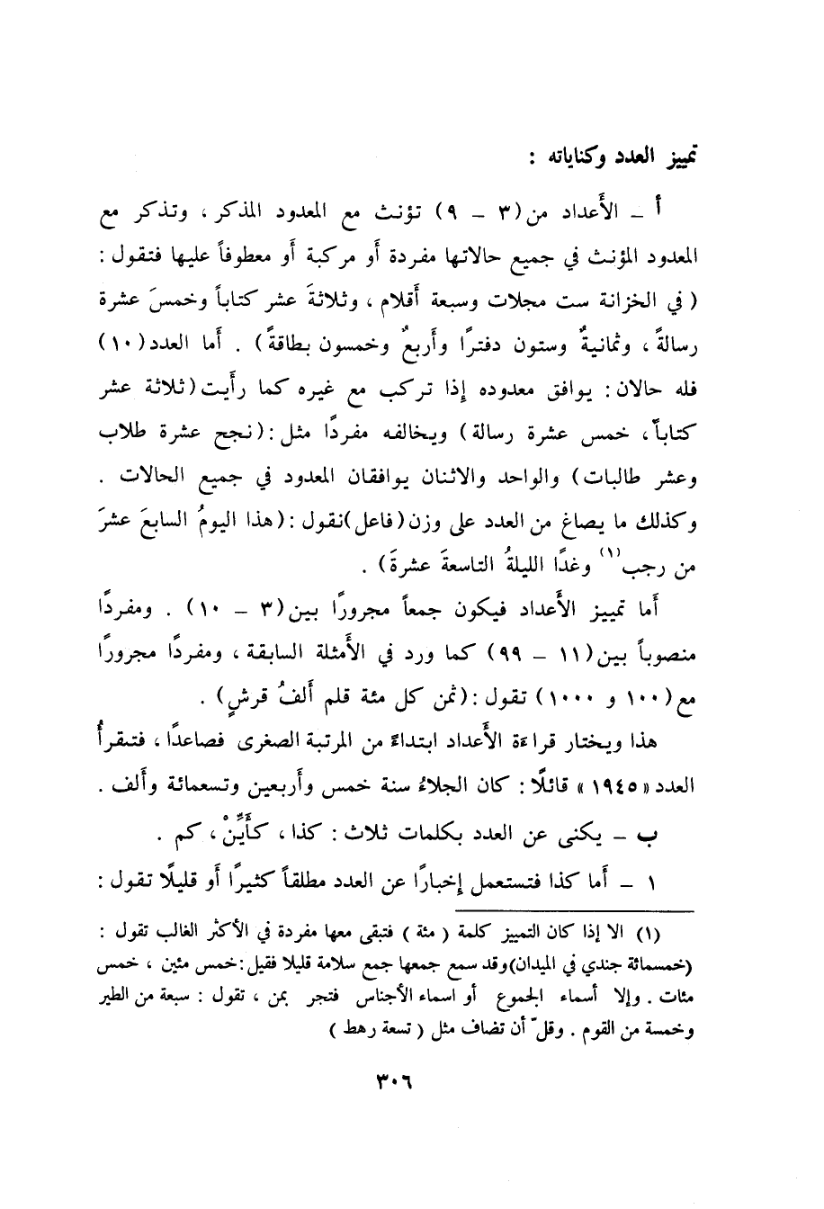 هذا ويختار قراءة الأَعداد ابتداءً من المرتبة الصغرى فصاعداً، فتقرأ العدد "1945" قائلاً: كان الجلاءُ سنة خمس وأَربعين وتسعمئة وأَلف.