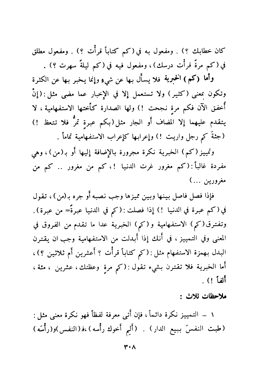 سطراً كان خطابك؟ ". ومفعول به في "كم كتاباً قرأت؟ ". ومفعول مطلق في "كم مرةً قرأْت درسك"، ومفعول فيه في "كم ليلةً سهرت؟ ".