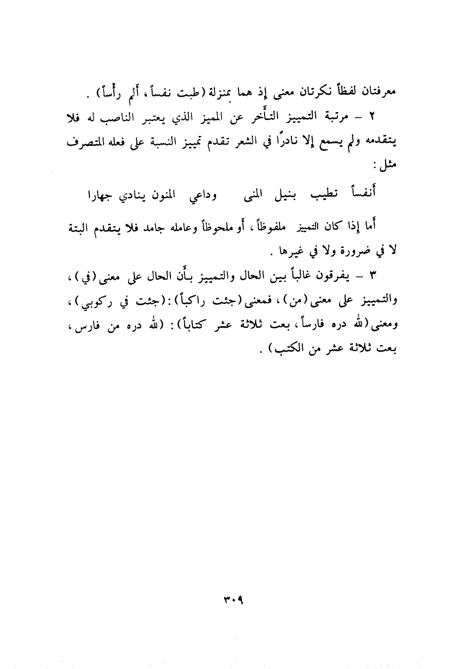 2- مرتبة التمييز التأْخر عن المميز الذي يعتبر الناصب له فلا يتقدمه ولم يسمع إلا نادراً في الشعر تقدم تمييز النسبة على فعله المتصرف مثل: