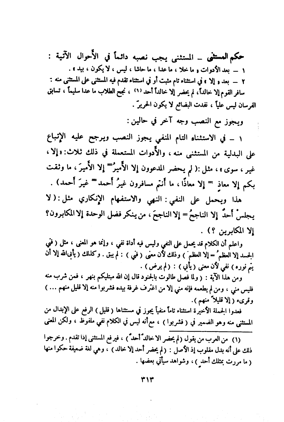 سافر القوم إلا خالداً، لم يحضر إلا خالداً أحد1، نجح الطلاب ما عدا سليماً، تسابق الفرسان ليس علياً، نفدت البضائع لا يكون الحرير.