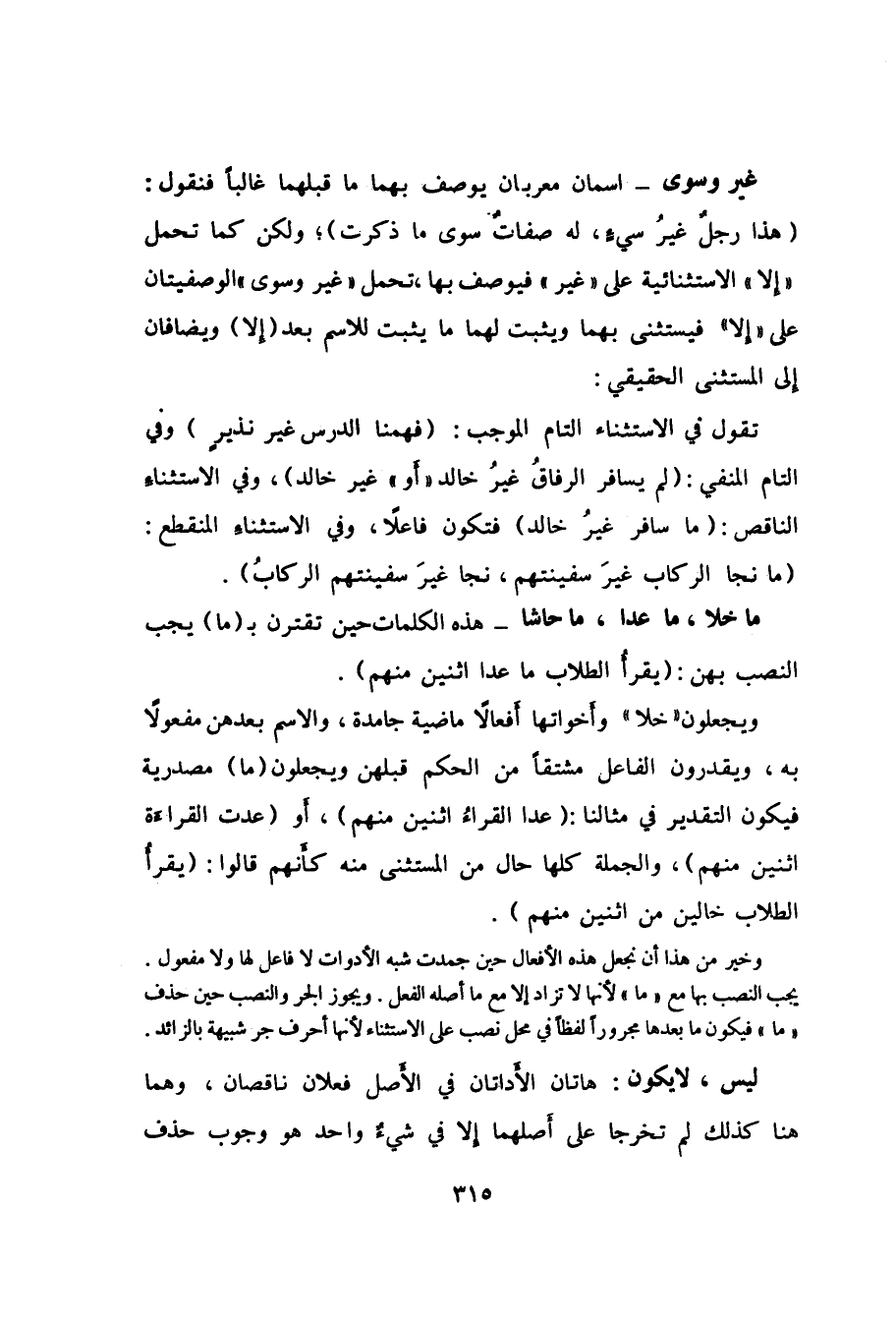 غير وسوى - اسمان معربان يوصف بهما ما قبلهما غالباً فنقول: "هذا رجلٌ غيرُ سيءٍ، له صفاتٌ سوى ما ذكرت"؛ ولكن كما تحمل "إلا" الاستثنائية على "غير" فيوصف بها، تحمل "غير وسوى" الوصفيتان على "إلا" فيستثنى بهما ويثبت لهما ما يثبت للاسم بعد "إلا" ويضافان إلى المستثنى الحقيقي: