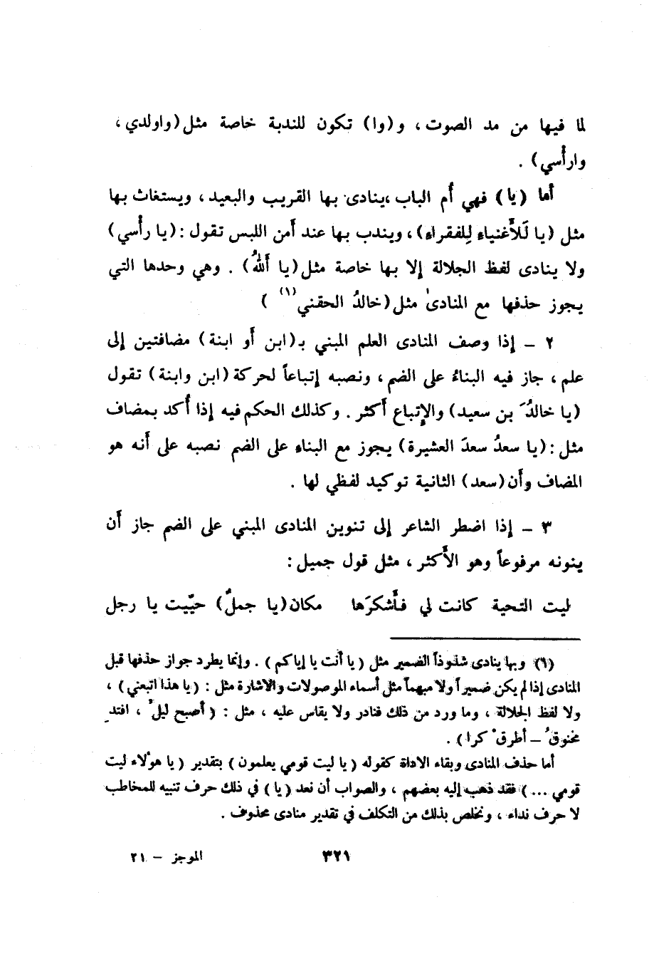 أما "يا": فهي أُم الباب، ينادى بها القريب والبعيد، ويستغاث بها مثل "يا للأَغنياءِ لِلفقراءِ"، ويندب بها عند أَمن اللبس تقول: "يا رأْسي" ولا ينادى لفظ الجلالة إلا بها خاصة مثل "يا أَللهُ". وهي وحدها التي يجوز حذفها مع المنادى مثل "خالدُ الحقني"1.