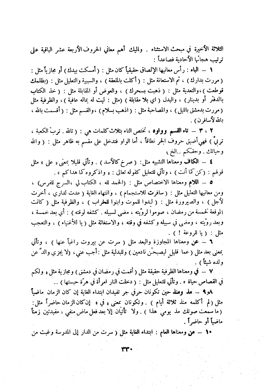 الثلاثة الأخيرة في مبحث الاستثناء. وإليك أهم معاني الحروف الأربعة عشر الباقية على ترتيب هجائها الأحادية فصاعداً: