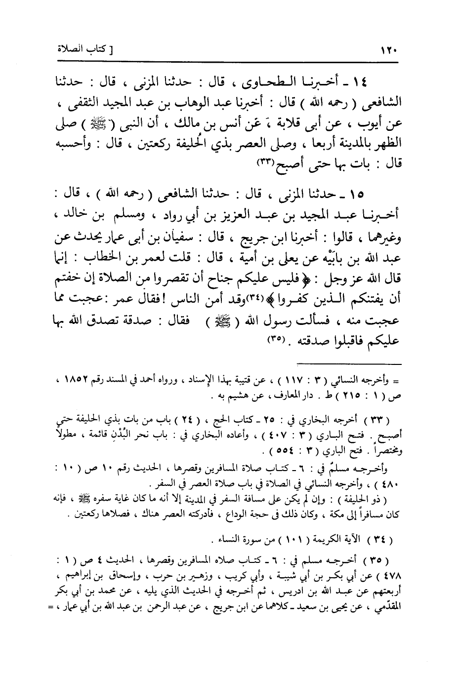 15 - أَخْبَرَنَا عَبْدُ الْمَجِيدِ بْنُ عَبْدِ الْعَزِيزِ بْنِ أَبِي رَوَّادٍ، وَمُسْلِمُ بْنُ خَالِدٍ , وَغَيْرُهُمَا قَالُوا: أَنْبَأَنَا ابْنُ جُرَيْجٍ، قَالَ: سَمِعْتُ ابْنَ أَبِي عَمَّارٍ، يُحَدِّثُ عَنْ عَبْدِ اللَّهِ بْنِ بَابَاهْ، عَنْ يَعْلَى بْنِ أُمَيَّةَ، قَالَ: قُلْتُ لِعُمَرَ بْنِ الْخَطَّابِ: إِنَّمَا قَالَ اللَّهُ عَزَّ وَجَلَّ: {أَنْ تَقْصُرُوا} [النِّسَاء: 101] مِنَ الصَّلَاةِ إِنْ خِفْتُمْ أَنْ يَفْتِنَكُمُ الَّذِينَ كَفَرُوا , وَقَدْ أَمِنَ النَّاسُ فَقَالَ عُمَرُ: عَجِبْتُ مِمَّا عَجِبْتَ مِنْهُ , فَسَأَلْتُ رَسُولَ اللَّهِ صَلَّى اللهُ عَلَيْهِ وَسَلَّمَ , فَقَالَ: «§صَدَقَةٌ تَصَدَّقَ اللَّهُ بِهَا عَلَيْكُمْ , فَاقْبَلُوا صَدَقَتَهُ»